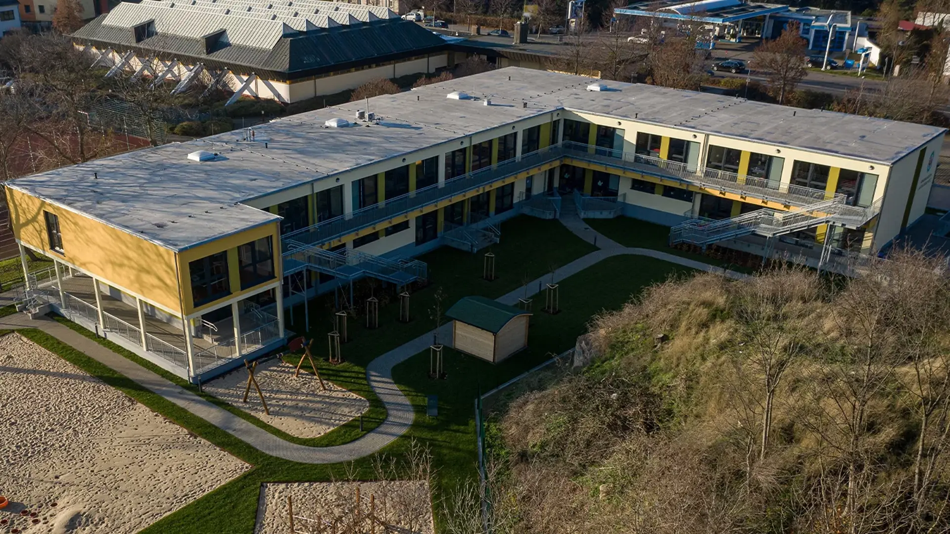 47 im ALHO Werk vorgefertigte Module setzen sich zu 7.000 Kubikmeter umbauten Raum zusammen. Und der hat es in sich: Mehr als 2.000 Quadratmeter stehen auf zwei Etagen für das umfangreiche Raumprogramm zur Verfügung. Das L-förmige Gebäude mit 51 und 38 Metern Länge umschließt einen Außenbereich, der ausreichend Platz zum Spielen und Toben bietet.