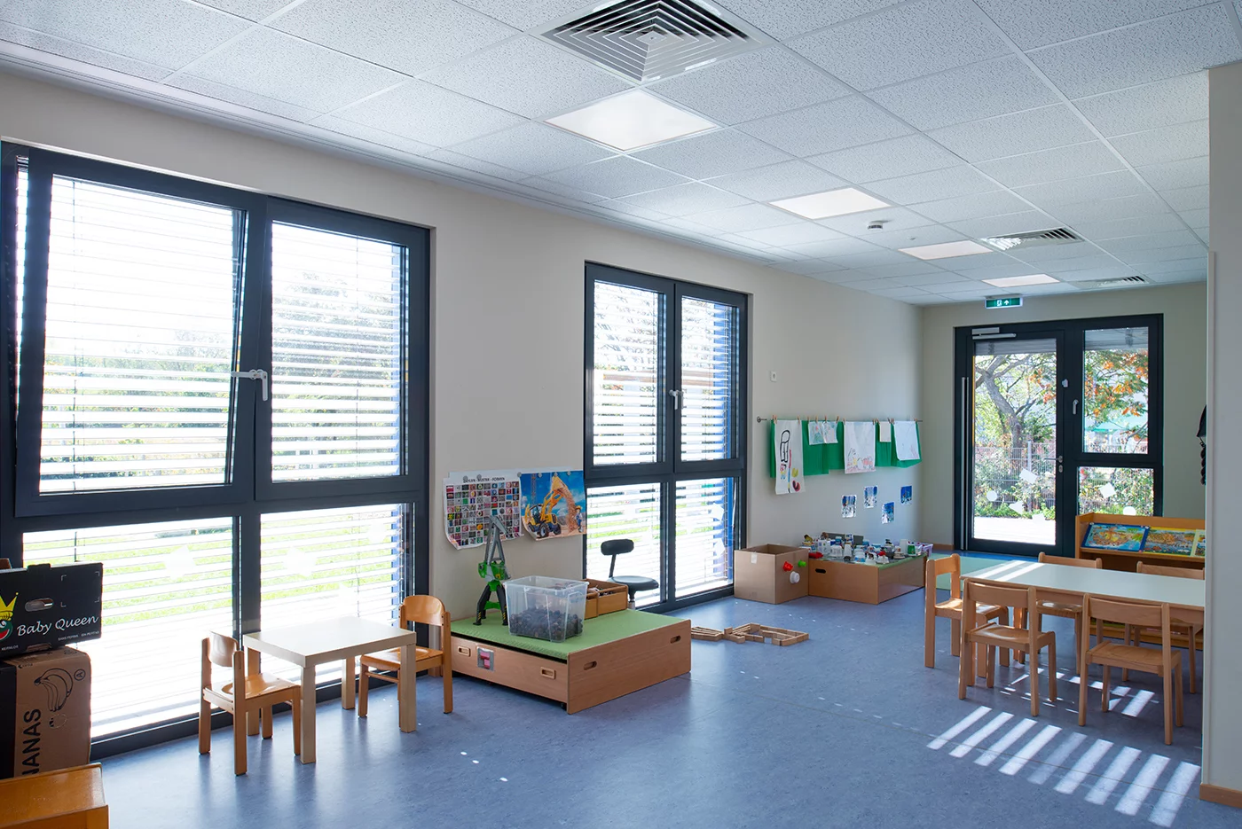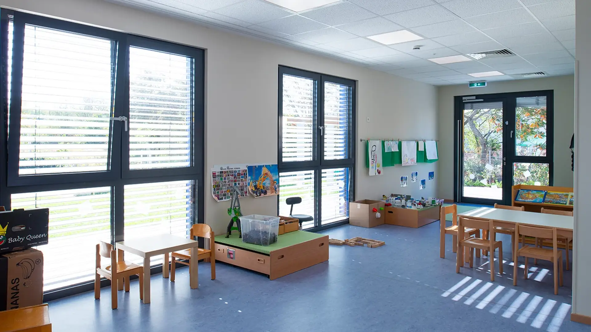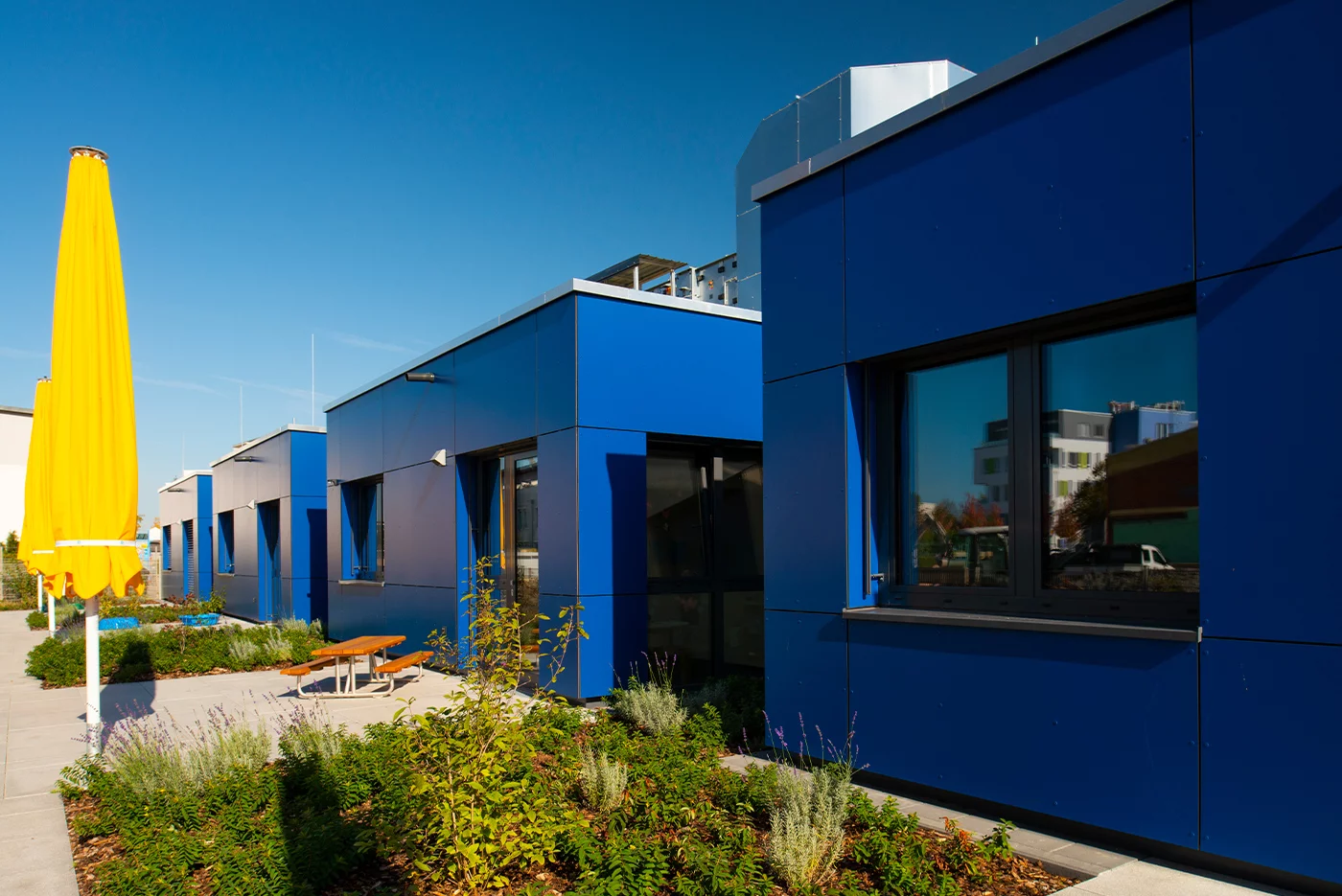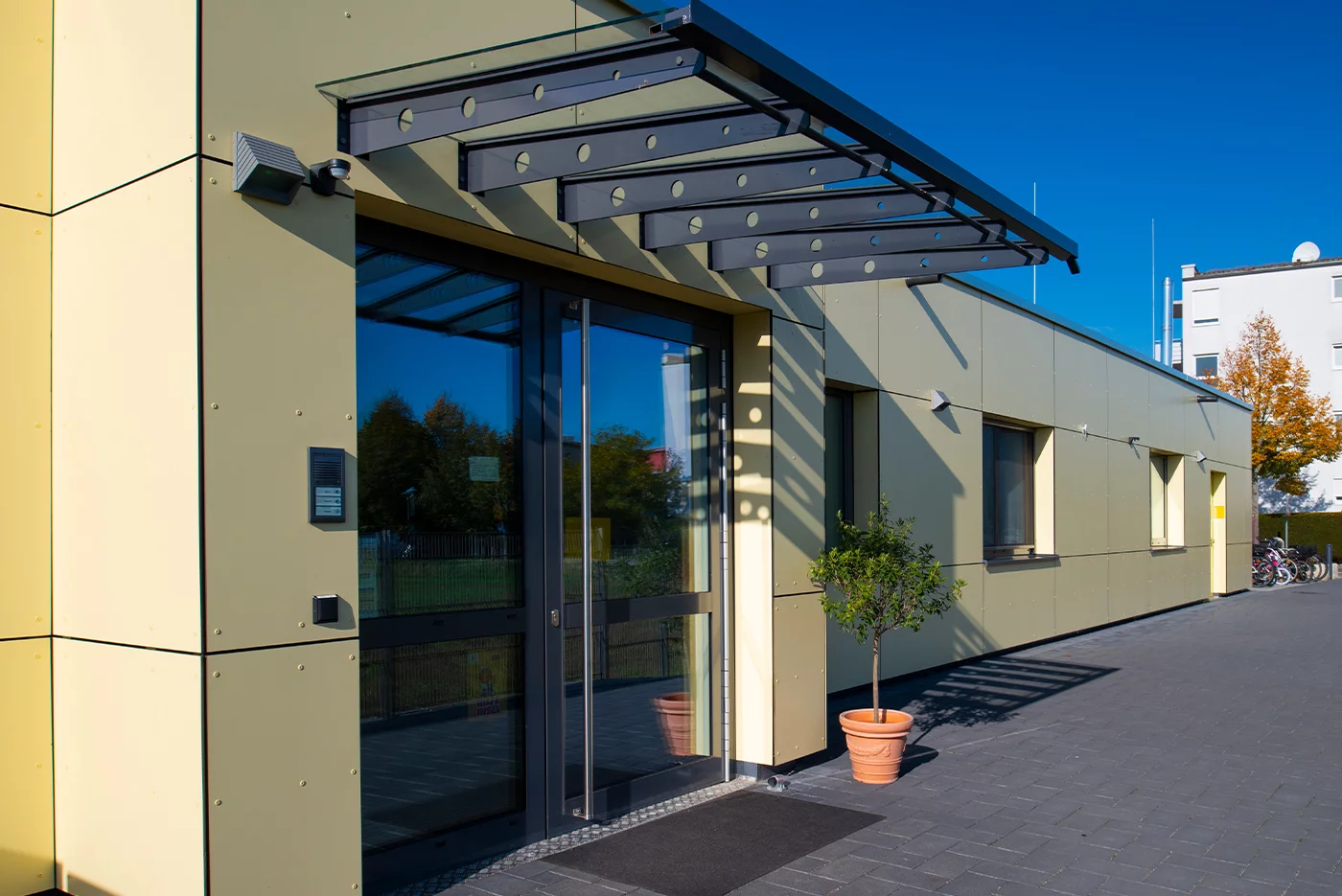 Jede Gruppeneinheit hat direkten Zugang zum Garten, bodentiefe Fenstertüren und Lichtkuppeln im Flachdach bringen viel Tageslicht ins Haus. Der große Garten erweitert das Spiel- und Lernangebot nach draußen in die Natur. Mit seiner hochwertigen Fassade aus HPL-Platten (High Pressure Laminate) in edlem Creme und dunklem Blau – übrigens die Trendfarbe des Jahres 2020 – ist das neue Gebäude der Hingucker im Stadtteil Bannholzgraben.