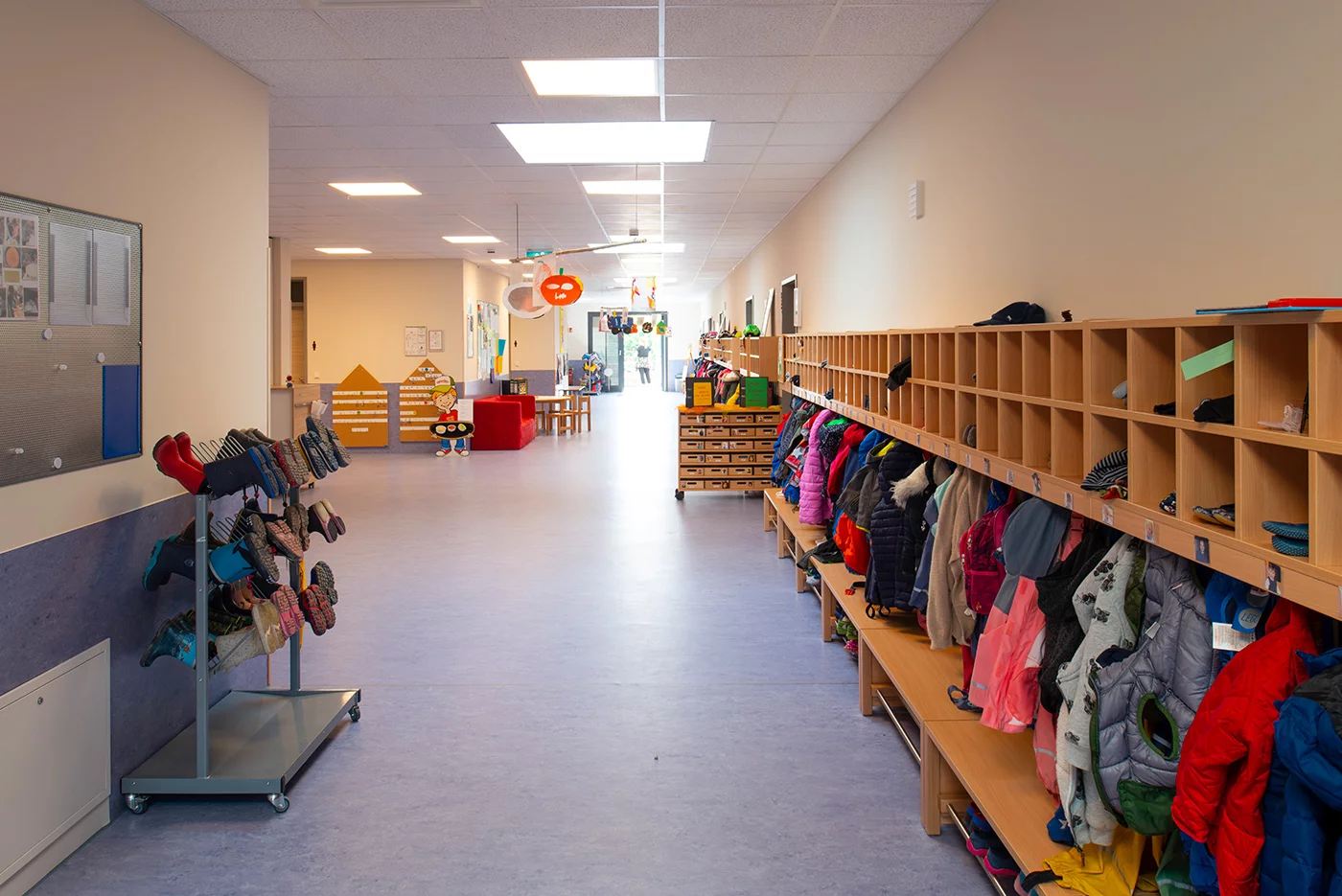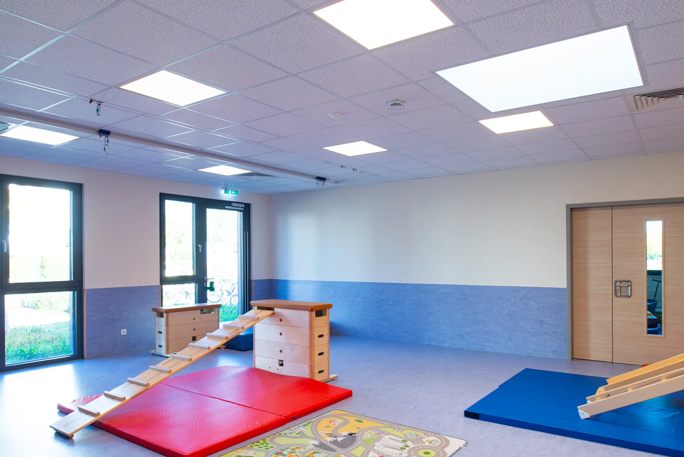 Auf der Haupteingangsseite sind neben einem großen Krippenraum mit Schlafbereich die Büros für die Einrichtungsleitung, die Personal- und ein Elternsprechzimmer angelegt. In einer geräumigen Küche wird das Mittagessen für die Kinder aufbereitet und im angrenzenden Bistro ausgegeben. Die 40 qm große Fläche kann über faltbare Trennwände dem zentralen Flur bei Bedarf zugeschaltet oder als separater, geschützter Bereich abgekoppelt werden. Multifunktion hat auch der große Bewegungsraum, in dem bei schlechtem Wetter getobt und geturnt werden kann, der aber auch für Feste und Veranstaltungen dient.
