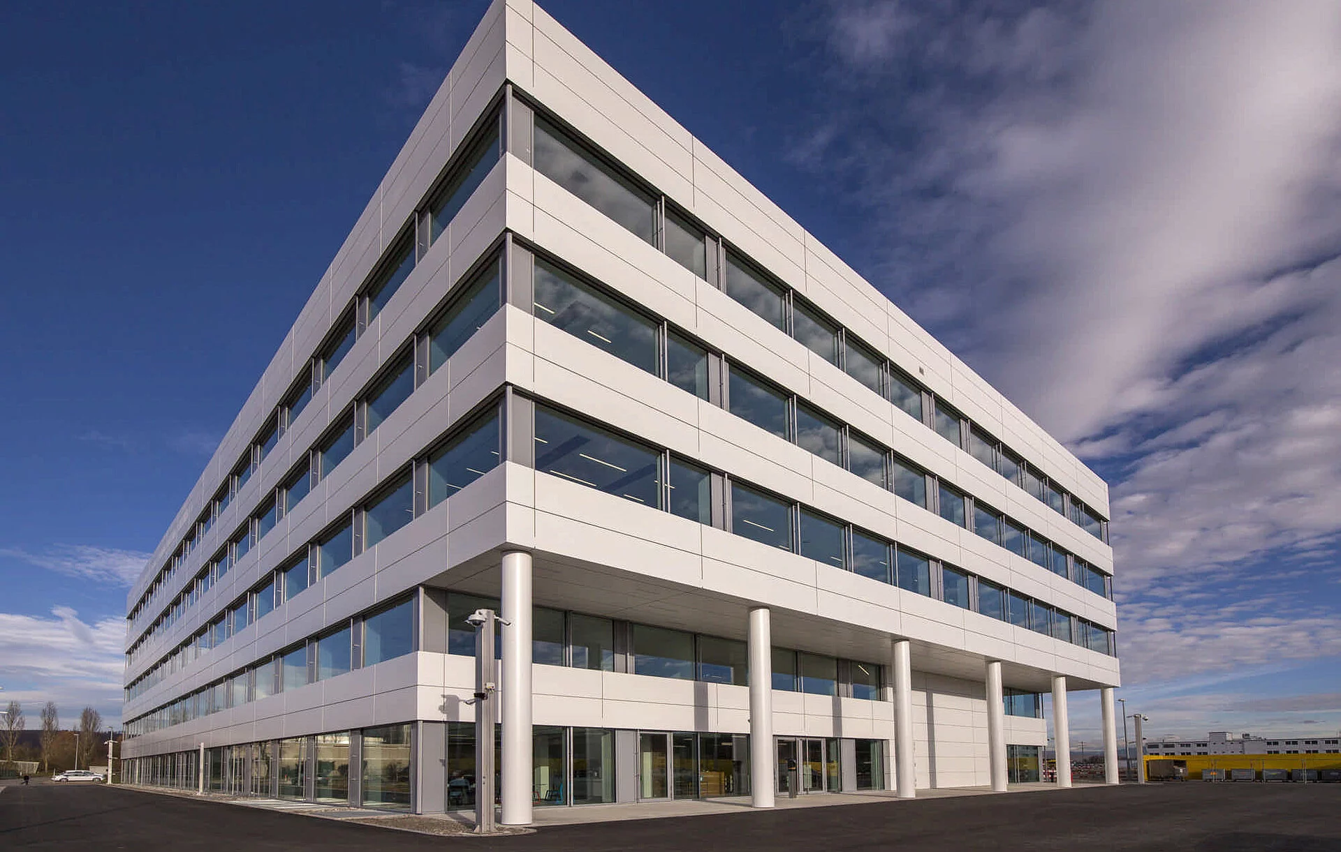 Um gerade im Winter mögliche Lieferverzögerungen auszuschließen, erfolgte ein Teil der Modulanlieferung von Bonn nach Kaiseraugst per Schiff über den Rhein. Die vorgehängte, hoch wärmegedämmte und hinterlüftete Fassade erhielt eine Verkleidung mit weißen, pulverbeschichteten Alupaneelen. Sie passt sich so gestalterisch der bereits etablierten zurückhaltenden und zeitlosen Architektursprache der Roche-Gebäude in Kaiseraugst und Basel optimal an. Das Technik-Staffelgeschoss setzt sich mit Aluminiumlamellen farblich und optisch ab.