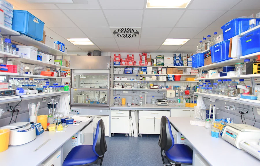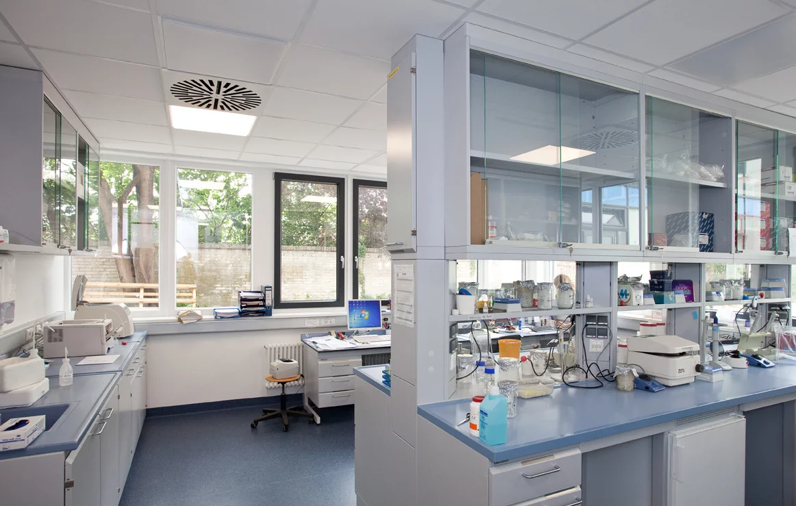 Möbliert sind die 18 vorgefertigten Raummodule mit hochwertiger Laboreinrichtung, wie z.B. Sicherheitswerkbänken, Wärme- und Trockenschränken sowie Laminar-Flow-Sicherheitswerkbänken, speziell für Forschungsarbeiten. Neben den Laboren umfassen die zwei Stockwerke jeweils einen eigenen Kühlraum, Büros, eine Teeküche, und einen Schulungs- bzw. Gruppenraum.