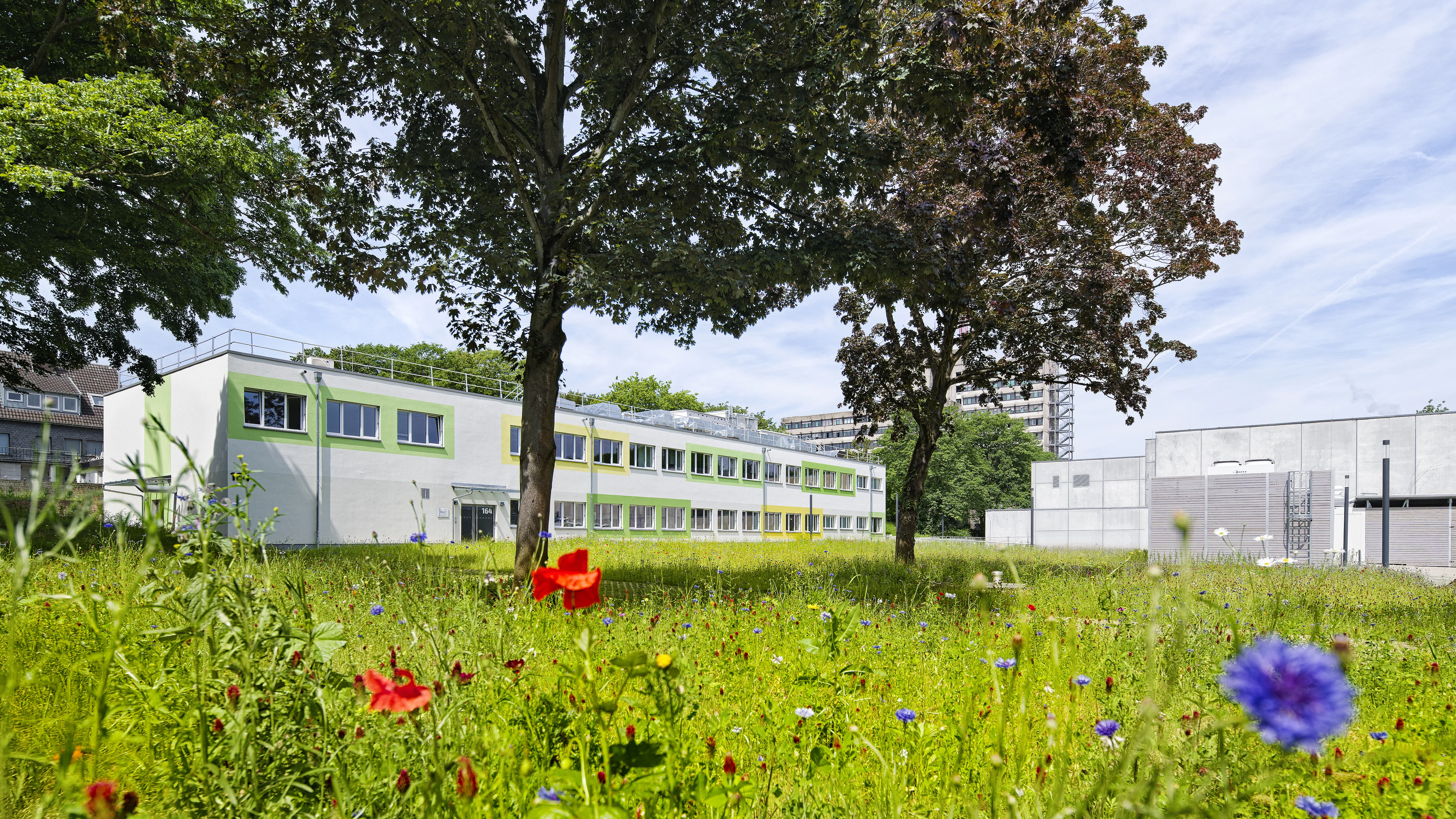 Für die Universität Bonn realisierte ALHO ein modernes Laborgebäude, das speziell auf die Anforderungen eines Saatgutlabors ausgelegt ist. Der Neubau entstand direkt am Rhein und wurde innerhalb von nur 24 Wochen umgesetzt, ohne den laufenden Unibetrieb zu beeinträchtigen. Das Laborgebäude beinhaltet Labore der Sicherheitsstufe S1, ergänzt durch Büroflächen, Sanitäranlagen sowie ein Erdlager zur Erdaufbereitung. Sämtliche Bereiche erfüllen die hohen technischen und hygienischen Sicherheitsanforderungen des Laborbetriebs. Die Außenanlage überzeugt durch eine ansprechende Grünfläche, die zum Entspannen einlädt.