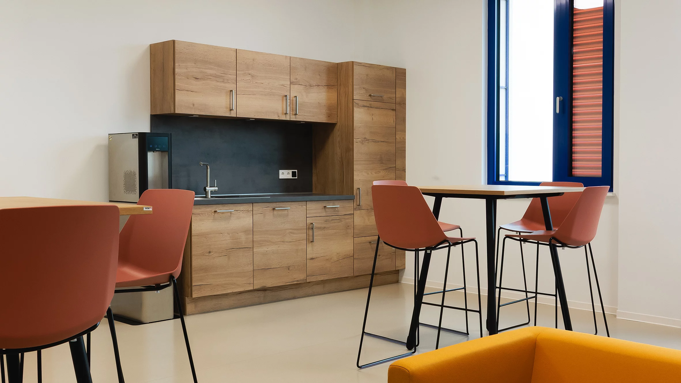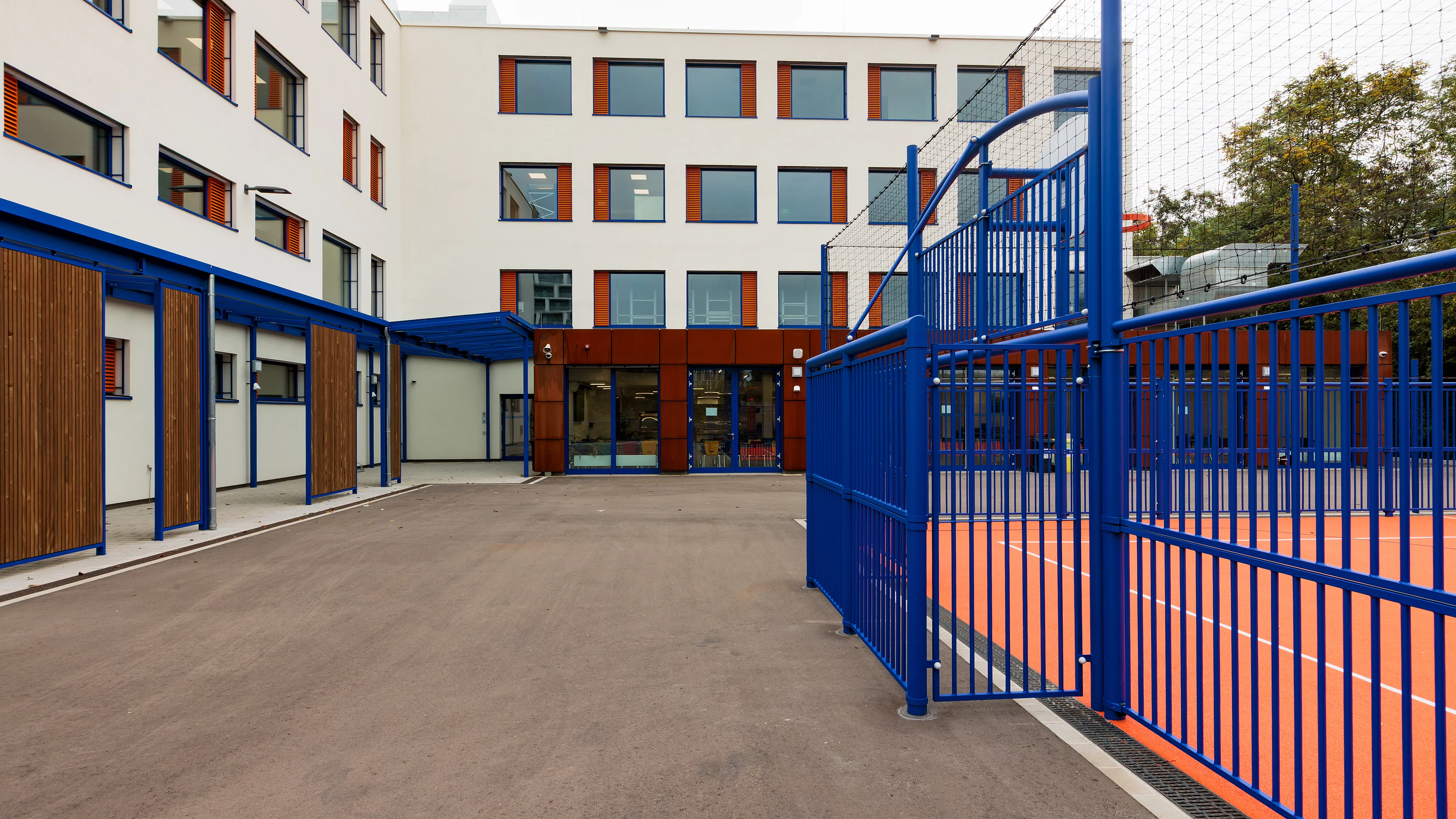 Das neue Schulgebäude überzeugt durch eine moderne, lichtdurchflutete Architektur mit einem großzügigen Eingangsbereich über zwei Etagen. Im Erdgeschoss befindet sich ein Schulrestaurant mit Küchenbereich, welches Platz für 250 Personen bietet. Die hochwertige, gemütliche Gestaltung schafft einen Raum, in dem sich Schüler wohlfühlen und entspannen können. Darüber hinaus verfügt das Gebäude über fünf traditionelle Klassenräume, vier moderne Ateliers, sechs voll ausgestattete Laboratorien für die Bereiche Elektro, Informatik und Chemie, jeweils mit Lager- und Vorbereitungsräumen, sowie zwei Projekträumen und einen Fitnessraum mit Umkleiden. Besonderer Wert wurde auf den Schallschutz gelegt, da in vielen Räumen mit Maschinen und Geräten gearbeitet wird. Akustikdecken und Schallschutztüren sorgen für eine angenehme Lernatmosphäre. Dank der modernen technischen Ausstattung sind die Schüler optimal darauf vorbereitet, sich nach ihrem Abschluss schnell im Berufsleben zurechtzufinden. Der Außenbereich wurde mit Blick auf das Wohlbefinden der Schüler gestaltet. Er bietet Raum für Entspannung, Austausch und Aktivitäten im Freien. Ein multifunktionales Sportgelände ermöglicht verschiedene Sportarten und fördert Bewegung und Gemeinschaft gleichermaßen. Energietechnisch erfüllt das Gebäude die neusten Standards: Eine Photovoltaikanlage, eine Wärmepumpe sowie eine Lüftungsanlage mit Wärmerückgewinnung tragen zu einem nachhaltigen Betrieb bei.