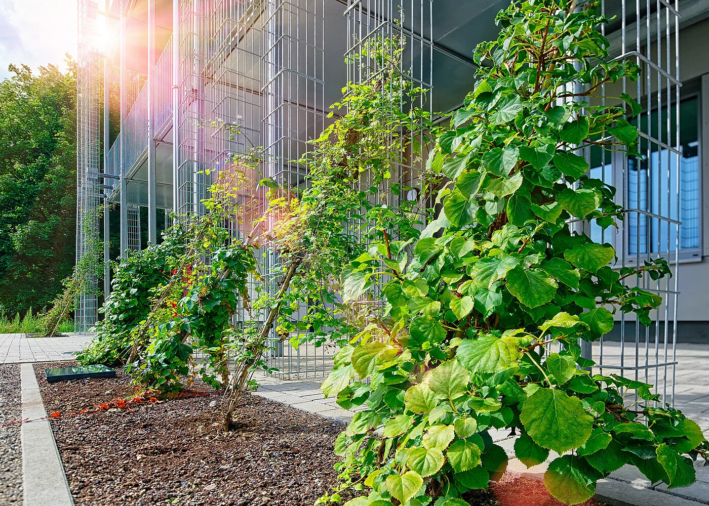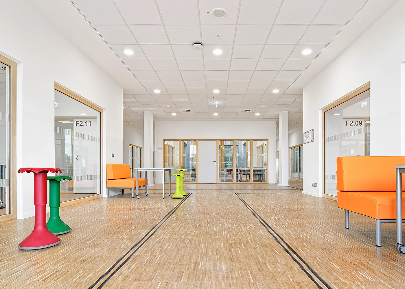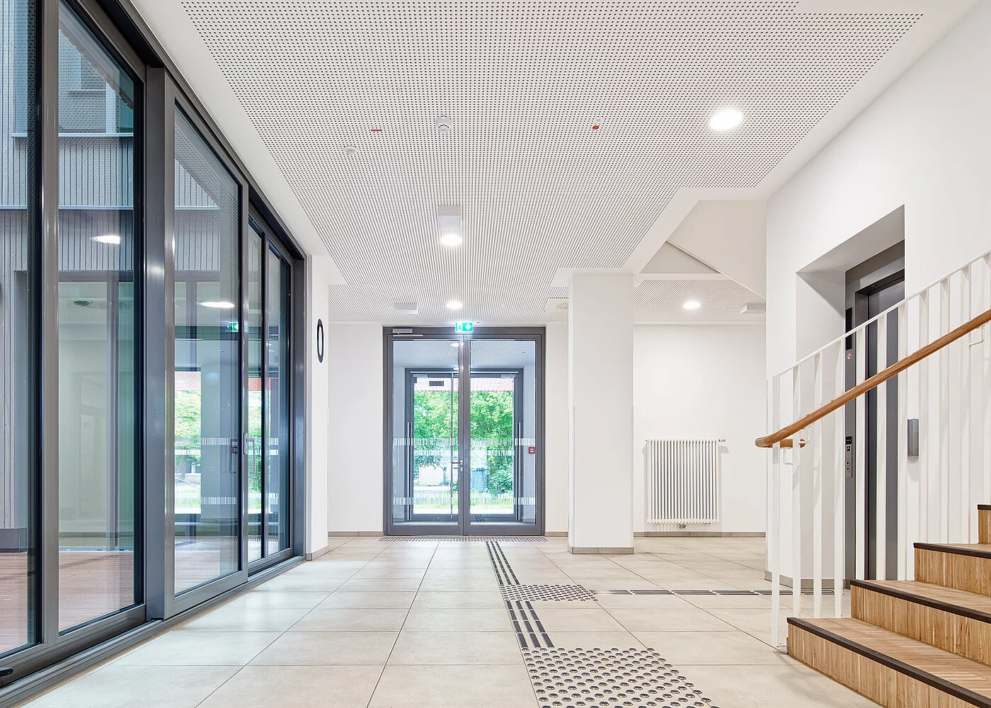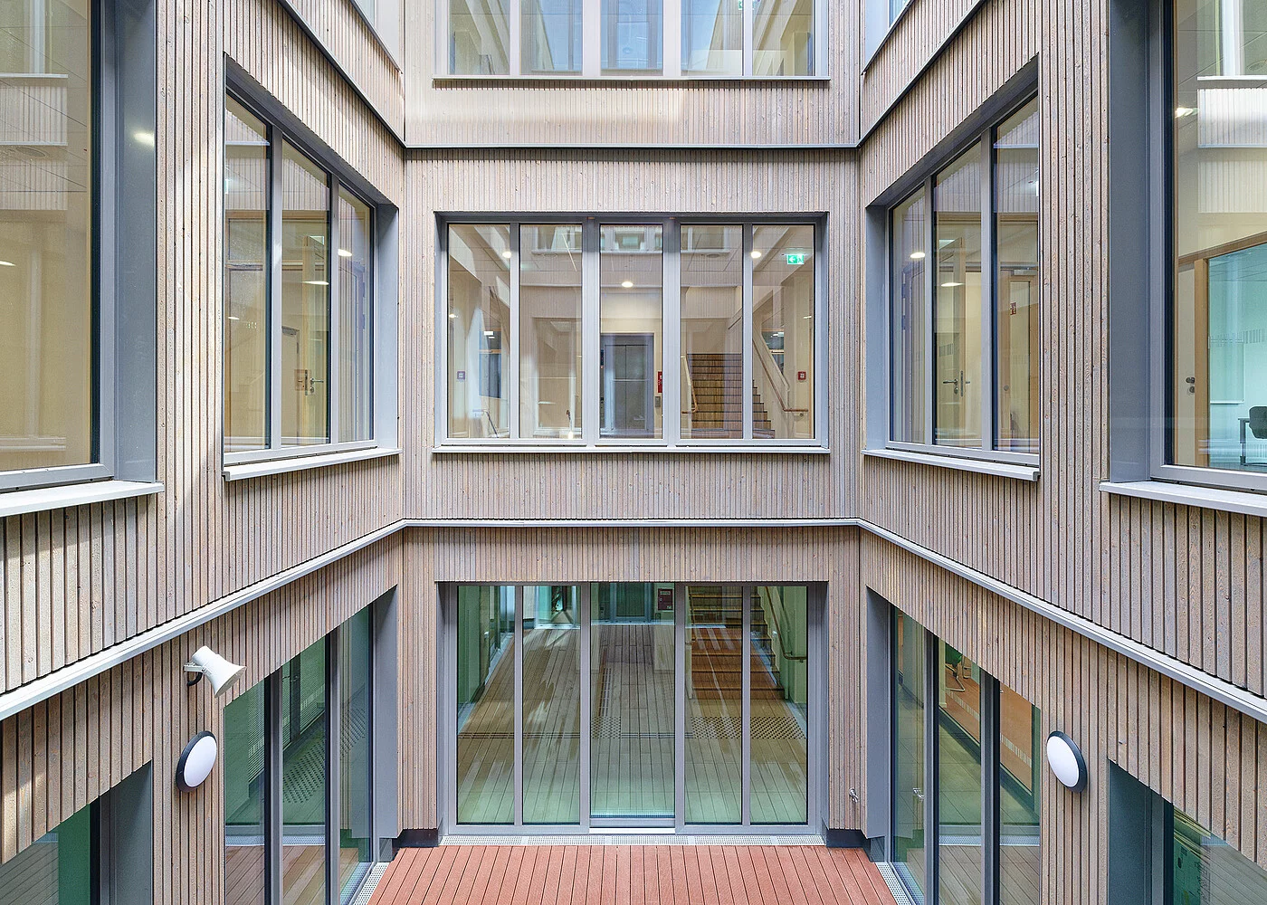 Besonderen Wert legt das Projekt auf Nachhaltigkeit und gestalterische Qualität. So verfügt das Gebäude über ein Gründach, eine begrünte Fassade, eine Dachterrasse und ein lichtdurchflutetes Atrium. Die Fassadengestaltung kombiniert eine Vorhangfassade aus Trespa und Holz mit Holz-Aluminium-Fenstern, wodurch ein modernes und zugleich natürliches Erscheinungsbild entsteht. Innen überzeugen die Clusterbereiche durch offene Flurverglasungen, Parkettböden und funktionale Glastrennwände.