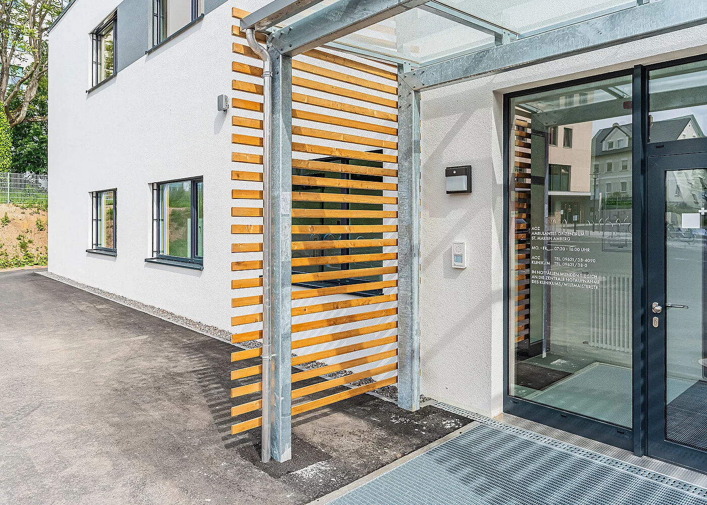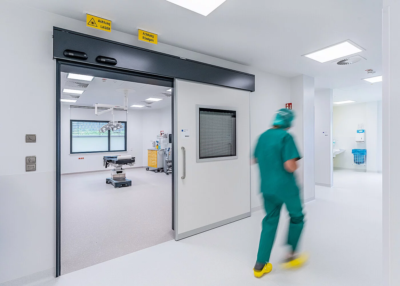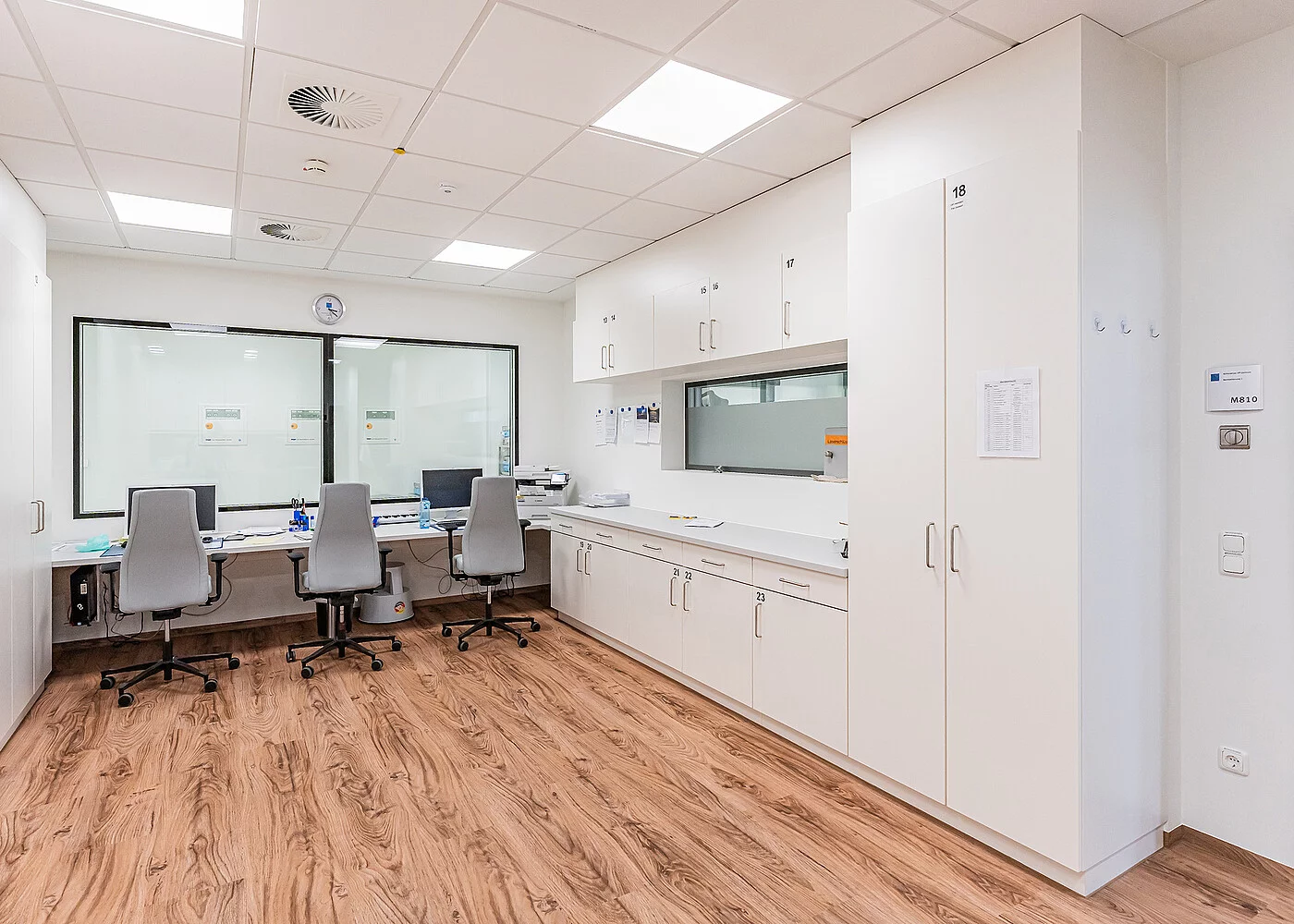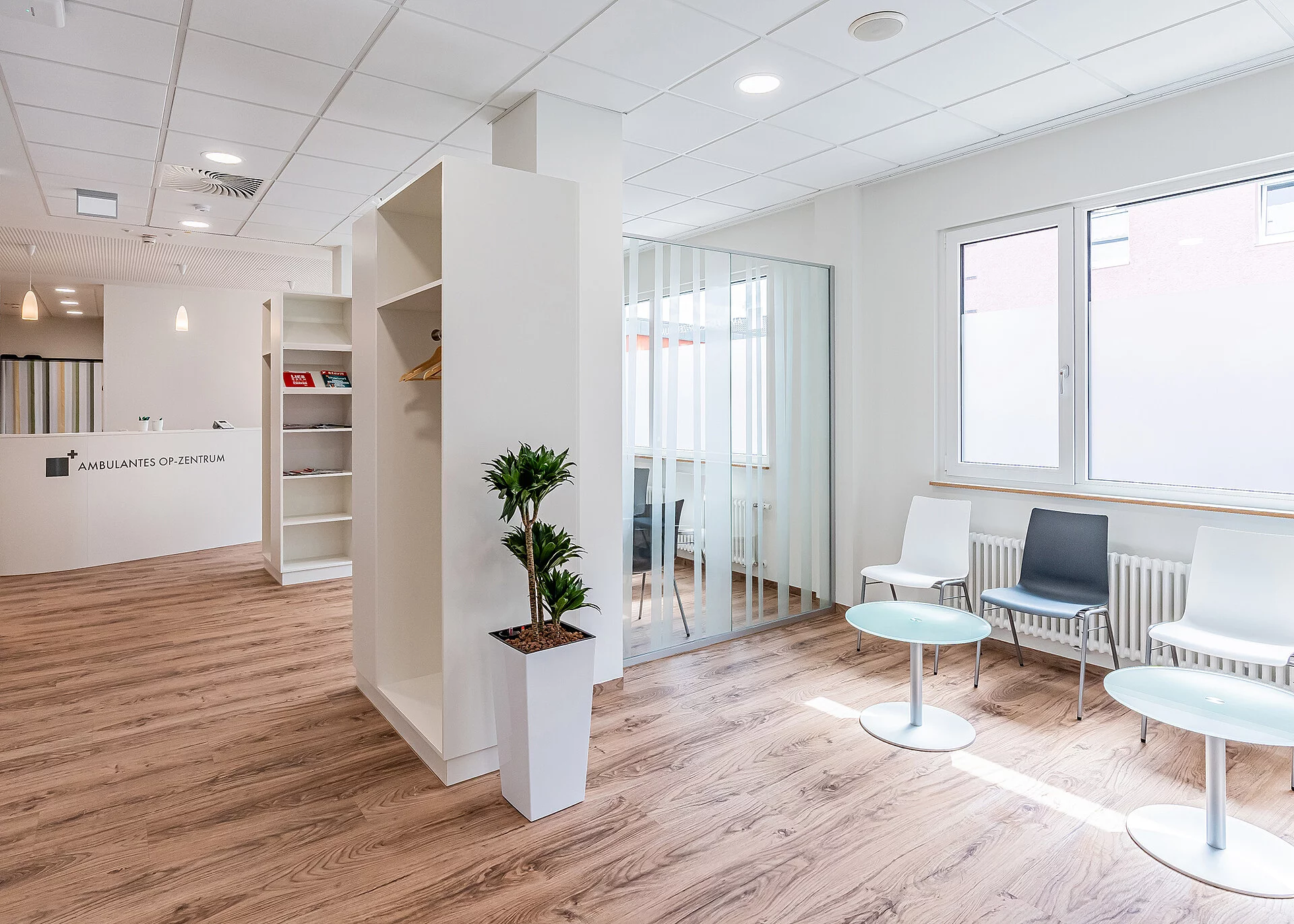 „Mit der Modulbauweise konnten wir beim Bauen im laufenden Bestand die Lärmbelästigung für unsere Patienten erheblich reduzieren“, weist Robert Wieczorek auf einen großen Vorteil beim sauberen und leisen Bauen mit Raummodulen hin. „Und: Wir haben enorm viel Bauzeit gegenüber der konventionellen Bauweise gewonnen“, so der Bauverwaltungsleiter und spricht dabei den wohl größten Vorteil beim modularen Bauen an, den auch Architekt Andreas Eckl bestätigt: „Die verkürzte Bauzeit vor Ort ist bei der Modulbauweise unschlagbar. Sie entsteht durch die witterungsunabhängige Fertigung der Module im Werk, die zugleich auch eine höhere Präzision beim Bauen zur Folge hat. Generell sind Projekte in Modulbauweise als Generalunternehmerprojekte angelegt. Für die Bauherren reduzieren sich damit auch organisatorische Hürden und Risiken wie zum Beispiel die Schnittstellenproblematik zwischen den vielen Einzelgewerken, denn sie bekommen das Gebäude ‚aus einer Hand’.“ Seit Anfang April 2022 werden im Neubau die ersten Operationen durchgeführt. Die Klinikverwaltung rechnet mit etwa 4.000 ambulanten Eingriffen pro Jahr. Im Erdgeschoss des 41 Meter langen und 22 Meter breiten Gebäudes stehen hierfür derzeit zwei Operationssäle mit jeweils 40 Quadratmetern Fläche zur Verfügung. Sollte der Bedarf steigen, kann ein dritter OP-Saal durch die Umnutzung und Zusammenlegung zweier angrenzender Räume geschaffen werden. Die dafür erforderlichen technischen Vorkehrungen wurden bereits getroffen, um einen späteren Umbau schnell und reibungslos zu ermöglichen. Das Gebäude ist vollständig in die Infrastruktur des Klinikums integriert, einschließlich der Versorgung mit medizinischen Gasen und der Brandmeldeanlage. Neben den OP-Sälen sowie einer großzügigen hellen und freundlichen Empfangszone mit Wartebereich befinden sich im Erdgeschoss außerdem Umkleiden für die Patienten, Aufwachräume und Bereiche für die Nachüberwachung, sanitäre Anlagen, Büroräume, Aufenthaltsräume für das Personal, sowie Räume für Ent- und Versorgung. In dem um etwa 2,5 Meter zurückversetzten Obergeschoss des Neubaus wurden Einzel- und Doppelbüros für die Klinikverwaltung eingerichtet – insgesamt 20 Arbeitsplätze und zwei Besprechungsräume. Direkt über den Operationssälen befindet sich der großzügige Technikbereich, der die Versorgung beider Ebenen sicherstellt. Das Obergeschoss ist über zwei einläufige Stahltreppen an der Fassade erschlossen, die gleichzeitig als Rettungswege dienen. Darüber hinaus ist eine spätere Anbindung des Neubaus an das gegenüberliegende große Bettenhaus der Klinik geplant. Neben der medizintechnischen Ausstattung realisierte ALHO auch die architektonischen Entwürfe für hochwertige Schreinerarbeiten.