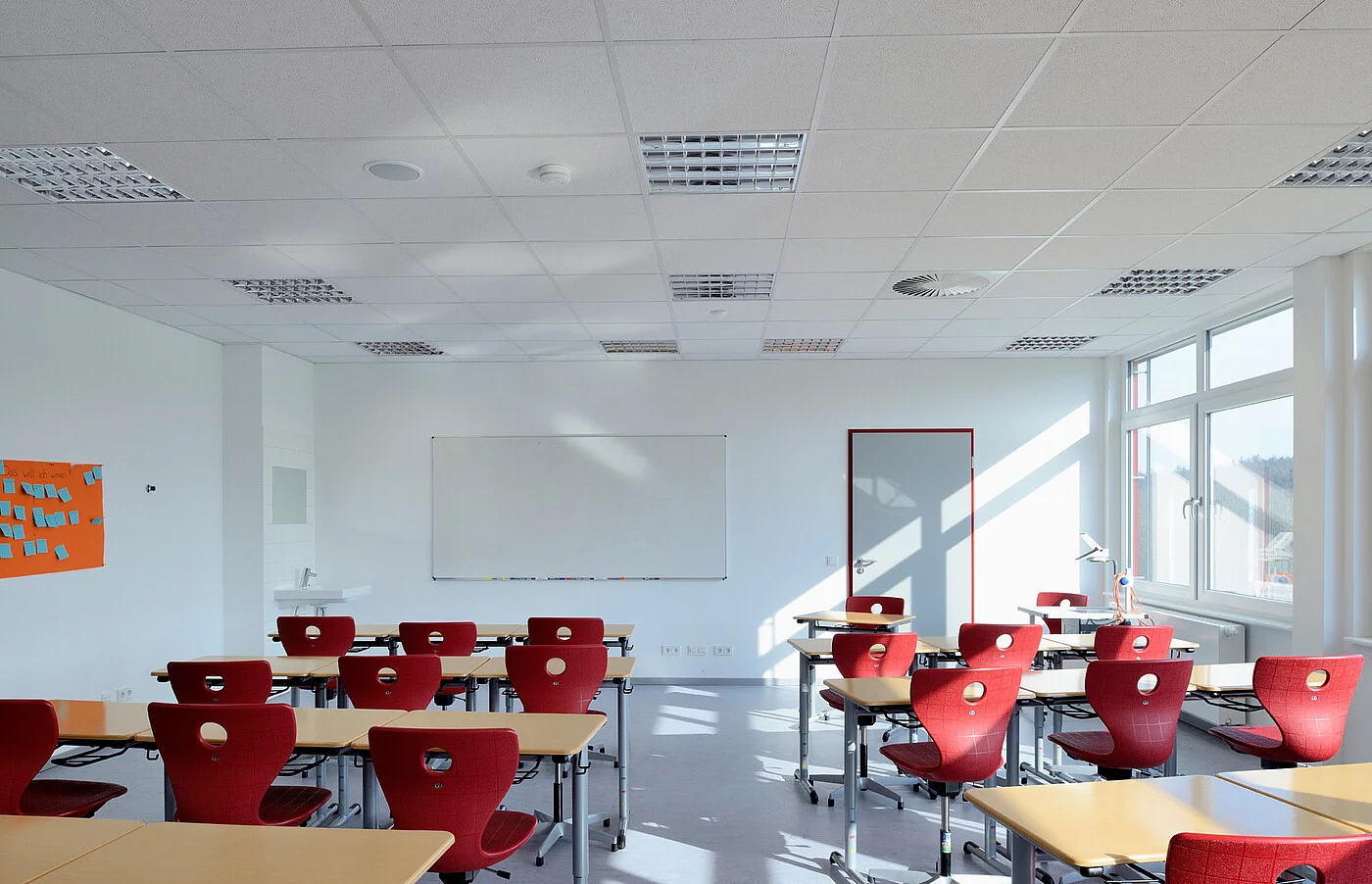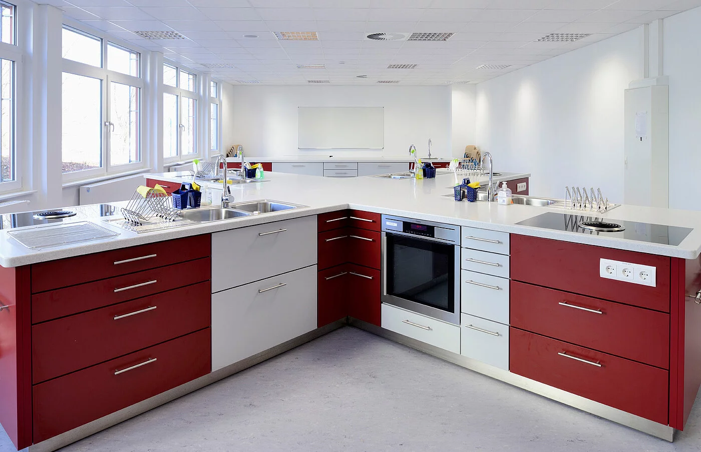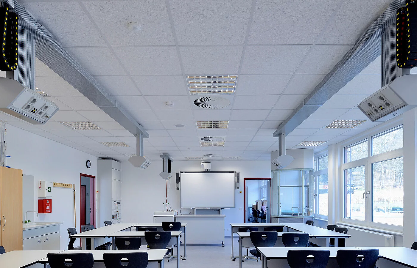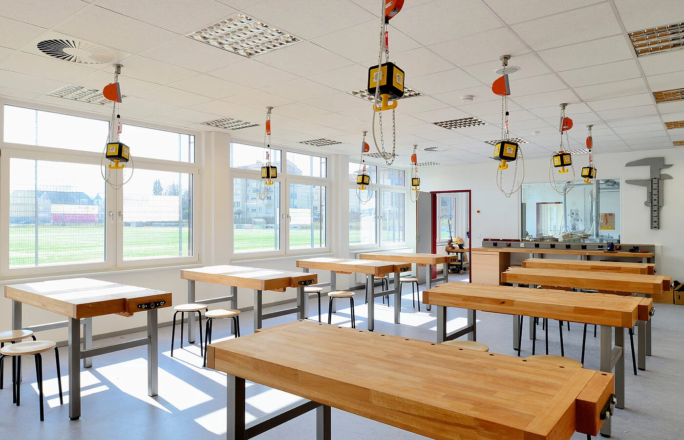 Stützenfreie Klassenräume mit Größen zwischen 60 und 80 Quadratmeter für die Fächer Physik, Biologie und Chemie reihen sich an Bereiche für die Vorbereitung und Theorievermittlung, an einen Lehrerstützpunkt mit eigenem Sanitärtrakt, an zugehörende Technik- und Lagerflächen. Außerdem gibt es Werkräume für die Holz- und Metallverarbeitung. Die Strom- und Gas-Anschlüsse an den Arbeitsplätzen befinden sich in von der Decke absenkbaren Schienen. Alle Fachklassenräume verfügen über separate Be- und Entlüftungsanlagen, beheizt werden sie über das bestehende Nahwärmenetz der Schule.