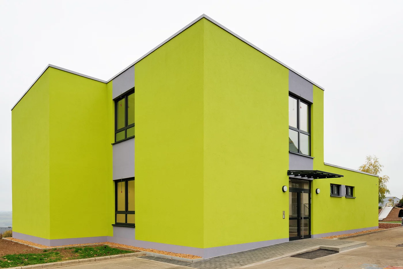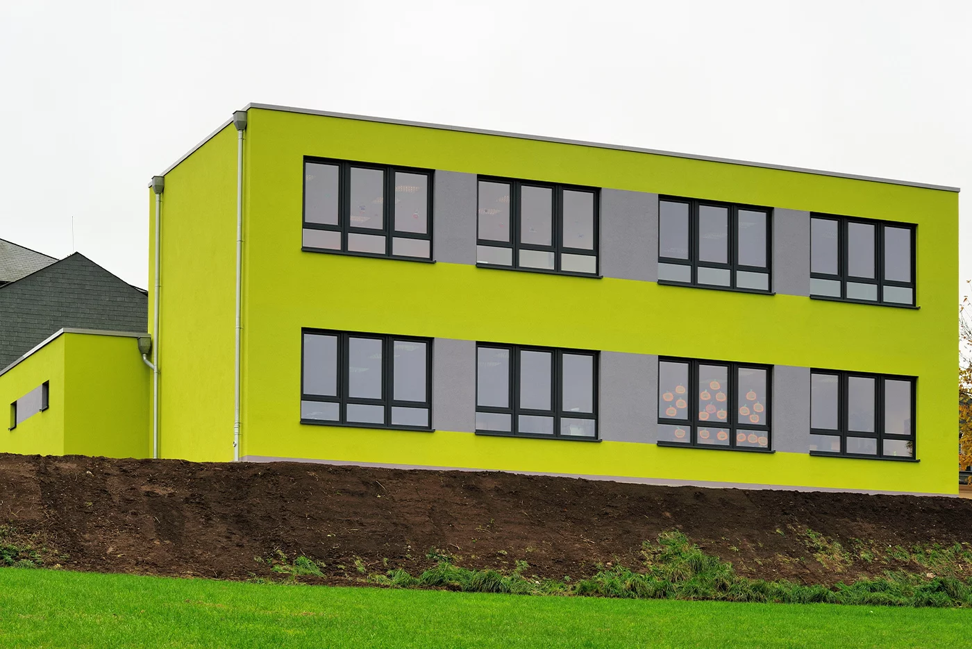 An vier Standorten entstanden parallel insgesamt 1.700 qm Neubaufläche für Schulen. Alle Schulen mussten in einer Zeit von maximal sechs Wochen erstellt werden. Eine dieser Schulen ist die in Heiderscheid. In leuchtendem grün-gelb präsentiert sich das neue Schulgebäude am Schoulwee. Insbesondere die kurze Bauzeit von nur 4 Wochen, in Verbindung mit der hohen geforderten Qualität des Gebäudes, sprachen für den Modulbau. Das gesamte Projekt konnte damit von der Auftragserteilung Mitte Juni bis zur Übergabe Mitte September in nur drei Monaten erfolgreich abgewickelt werden. So entstanden in dem zweigeschossigen Gebäude vier neue Klassenräume von jeweils fast 56 m² sowie Sanitärbereiche mit barrierefreier Ausstattung. Seit September 2010 finden hier rund 80 Schüler optimale Lern-Bedingungen.