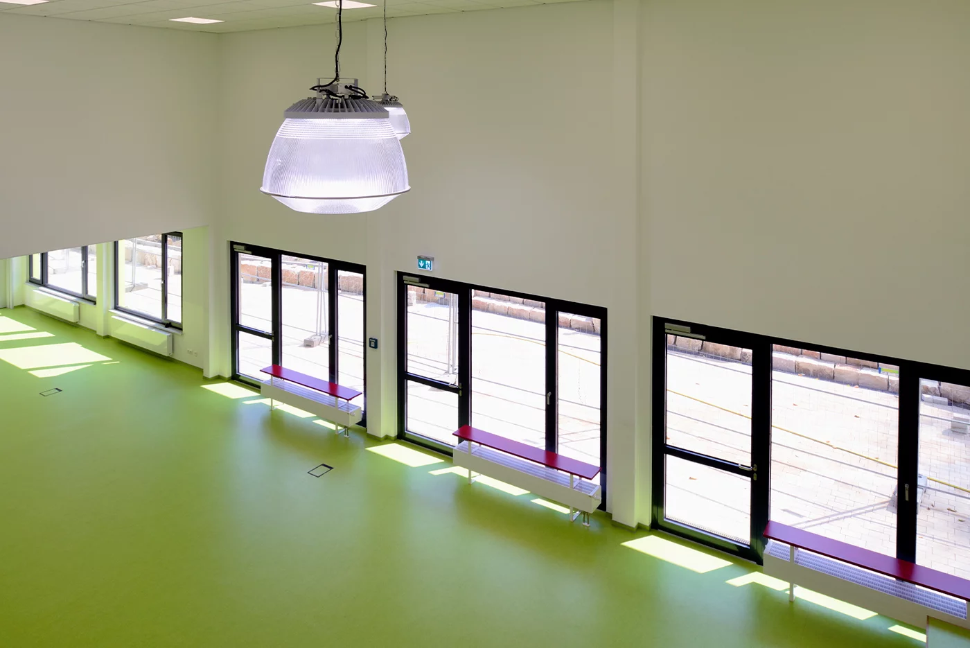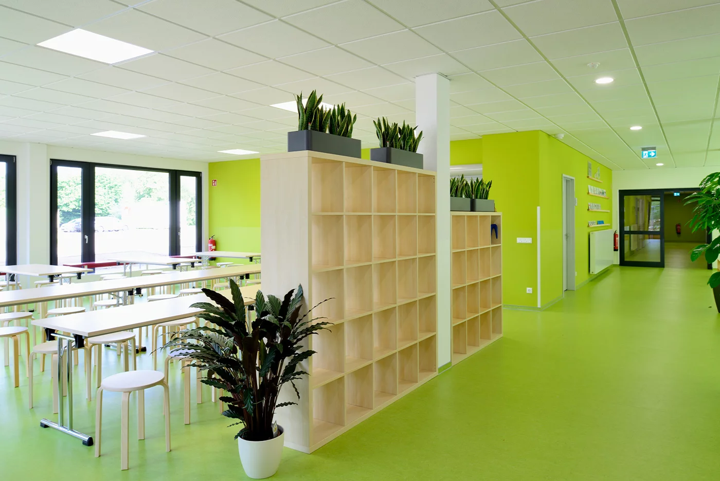 Von hier aus wird das Schulhaus über die offen gestaltete Mensa betreten, die nahtlos in eine zur Terrasse hin großflächig verglasten Pausenhalle bzw. Aula übergeht. Per mobiler Wand kann ein rund 60 qm großer Kreativraum mit mobiler Bühne der Aula zugeschaltet werden. Zwei Treppenhäuser und ein Aufzug sorgen für die barrierefreie und zudem brandschutzrechtlich einwandfreie Erschließung der oberen Etage. Hier befinden sich weitere Klassenräume, jeweils ein Fach- und Werkraum sowie die Räume der Schulleitung, das Lehrerzimmer mit Teeküche und ein Besprechungsraum mit den nötigen Nebenraum- und Sanitärzonen.