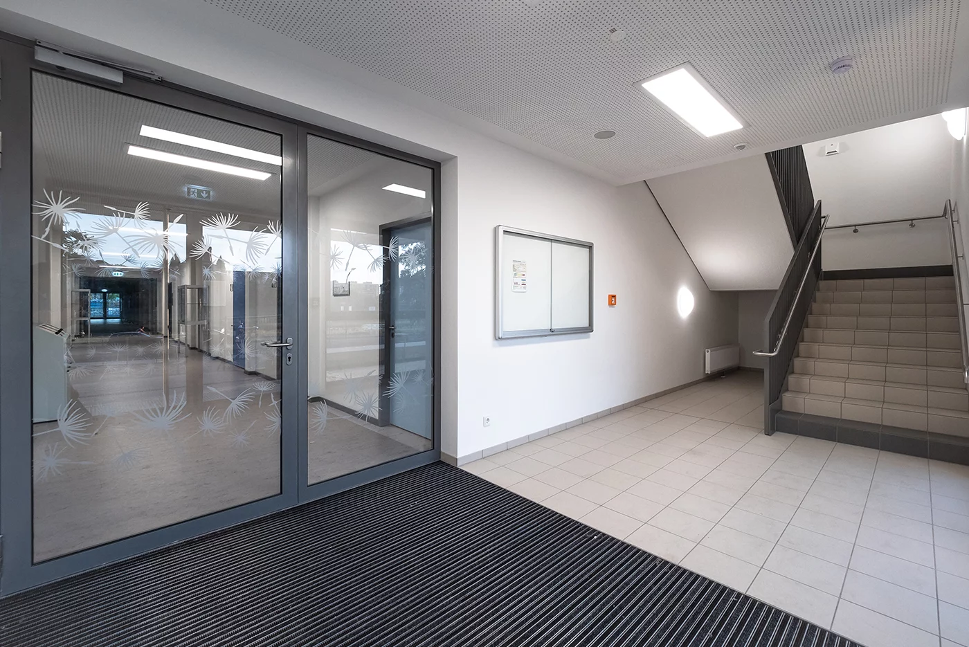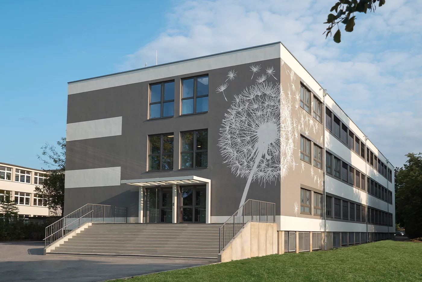 Die Schule ist barrierefrei über eine Rampe an der Südseite des Gebäudes erschlossen und verfügt über Treppenhäuser an jeder Stirnseite. Sehr gelungen ist die Gestaltung der anthrazitgrauen Putzfassade, die im Bereich der Fensterbrüstungen und der Flachdachattika mit weißen Bändern abgesetzt ist. Eine Pusteblumen-Malerei lockert die Flächen gestalterisch auf. Im Bereich der Sanitärfenster dient sie als Sichtschutz und setzt sich als Leitmotiv auch auf weiteren Fenstern und Glastüren fort.