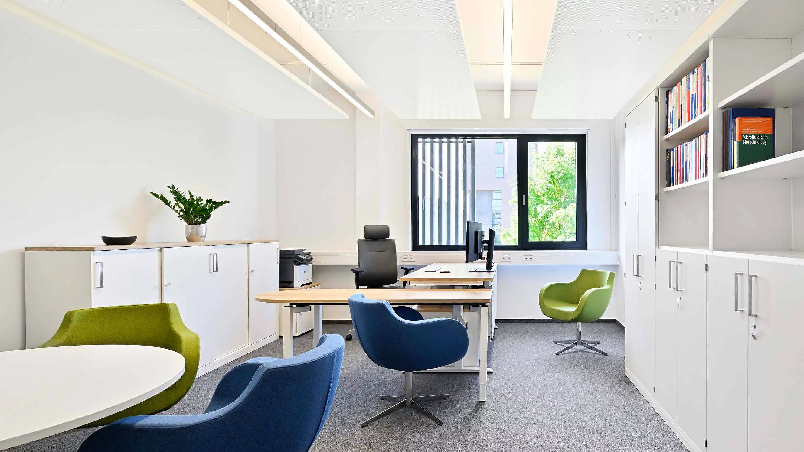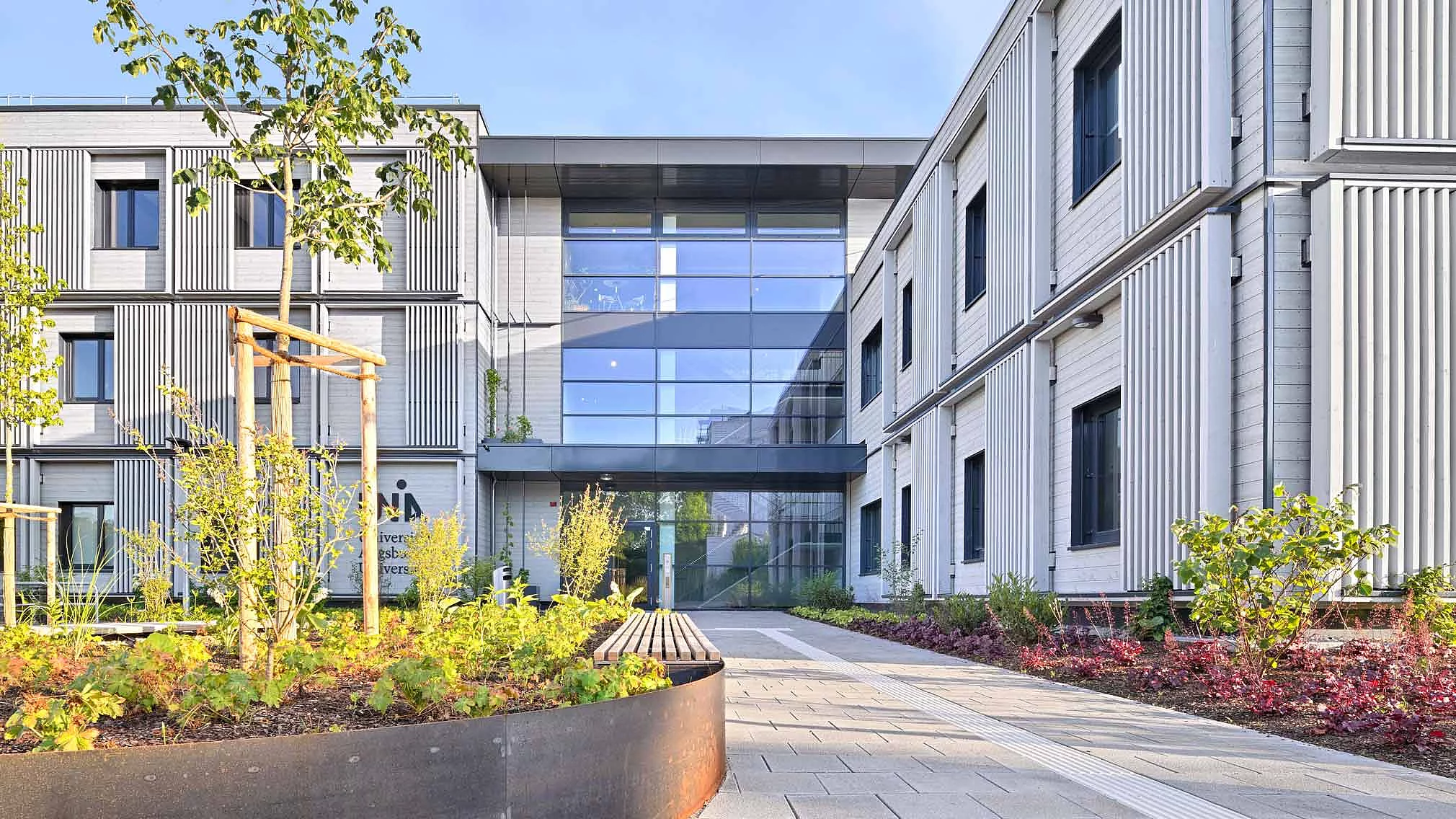 Somit sind aus 54 Modulen auf 2650 m2 insgesamt 40 neue Arbeitsplätze und 14 neue Labore für den Lehrstuhl der Bioorganischen Chemie, dem Lehrstuhl für Technische Biologie und der Professur für Computergestützte Biologie entstanden. Die Labore sind in den Sicherheitsstufen S1 und S2 klassifiziert und erfüllen damit die hohen Anforderungen an technischer Höchstleistung und hygienischer Sicherheit. Der normale Unibetrieb konnte dank der kurzen Bauzeit, welche wenig Störungen durch Lärm und Schmutz zur Folge hatte, ganz normal weiterlaufen. Besonderes Augenmerk lag auf der Nachhaltigkeit: In Bayern ist nachhaltiges Bauen gesetzlich vorgeschrieben, weshalb ressourcenschonendes Material eingesetzt wurde. Die hinterlüftete Fassade aus Fichtenholz mit integrierten Grünflächen trägt zur Kühlung des Gebäudes, zur Luftqualität und zum Schattenspenden bei. Das begrünte Dach mit Gefälldämmung funkgiert als natürlicher Wasserspeicher und kann 40%-90% des Jahresniederschlags zurückhalten. Ergänzend sichern eine Photovoltaikanlage, Wärmepumpentechnik und die Anbindung an das Fernwärmenetz eine energieeffiziente Versorgung. Fahrradstellplätze sowie Ladeinfrastruktur für E-Bikes und Elektroautos fördern eine nachhaltige Mobilität. Insgesamt liegt der Energiestandard des Gebäudes deutlich unter den gesetzlichen Vorgaben des Gebäudeenergiegesetzes (GEG).