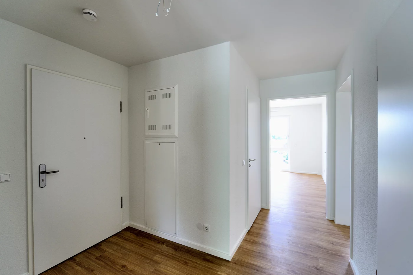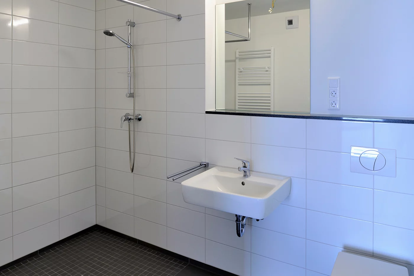 Im Falle des Neubaus Zschopaustraße bedeutete das für ALHO, die Entwurfsplanung exakt dem geforderten Wohnungsmix von zwölf 2-Zimmerwohnungen à 61,47 qm, zwölf 3-Zimmerwohnungen à 74,02 qm sowie zwölf 4-Zimmerwohnungen à 96,69 qm auf die rund 2.800 m² Wohnfläche anzupassen und die dafür nötigen Module im Sinne des seriellen Entwurfsgedankens in ein gleichmäßiges Modulraster einzubinden. Alle Wohnungen sind mit einem Meter breiten Türen, ausreichend Bewegungsfläche, schwellenlosen Balkonübergängen und bodengleich gefliesten Duschen barrierefrei gestaltet. Ihre Ausstattung erfolgte nach dem Ausbaustandard der WGL und konnte zu einem sehr hohen Grad im ALHO Werk vorgefertigt werden. Die Raummodule für die Bäder sogar zu 100 Prozent. Die Gliederung des Baukörpers in drei separat erschlossene Bereiche, erforderte die Integration dreier Erschließungszonen im Gebäude. Auch hier war die serielle Vorfertigung der Raummodule klar von Vorteil, denn die Treppenläufe und sogar die Aufzugskerne wurden ab Werk in die Module integriert.