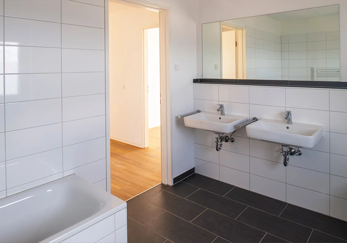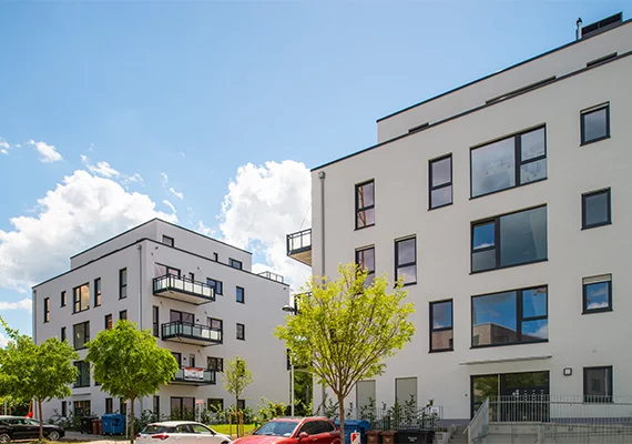 Beide Gebäude sollten mit jeweils vier oberirdischen Geschossen (einschließlich EG) ausgebildet werden, die zwölf Wohneinheiten beherbergen. KZA und ALHO nutzten die Vorgaben des Bebauungsplans voll aus und setzten den Bauten ein Staffelgeschoss als fünfte Etage obenauf. So konnten mit vergleichsweise geringen Mehrkosten zwei zusätzliche Vierzimmer-Wohnungen mit jeweils knapp 100 m2 „on top“ geschaffen werden: Insgesamt rund 1.800 Quadratmeter Bruttogeschossfläche pro Haus. Jede Wohnung hat zudem einen eigenen PKW- und Fahrradstellplatz in der Tiefgarage sowie einen Mieterkeller.