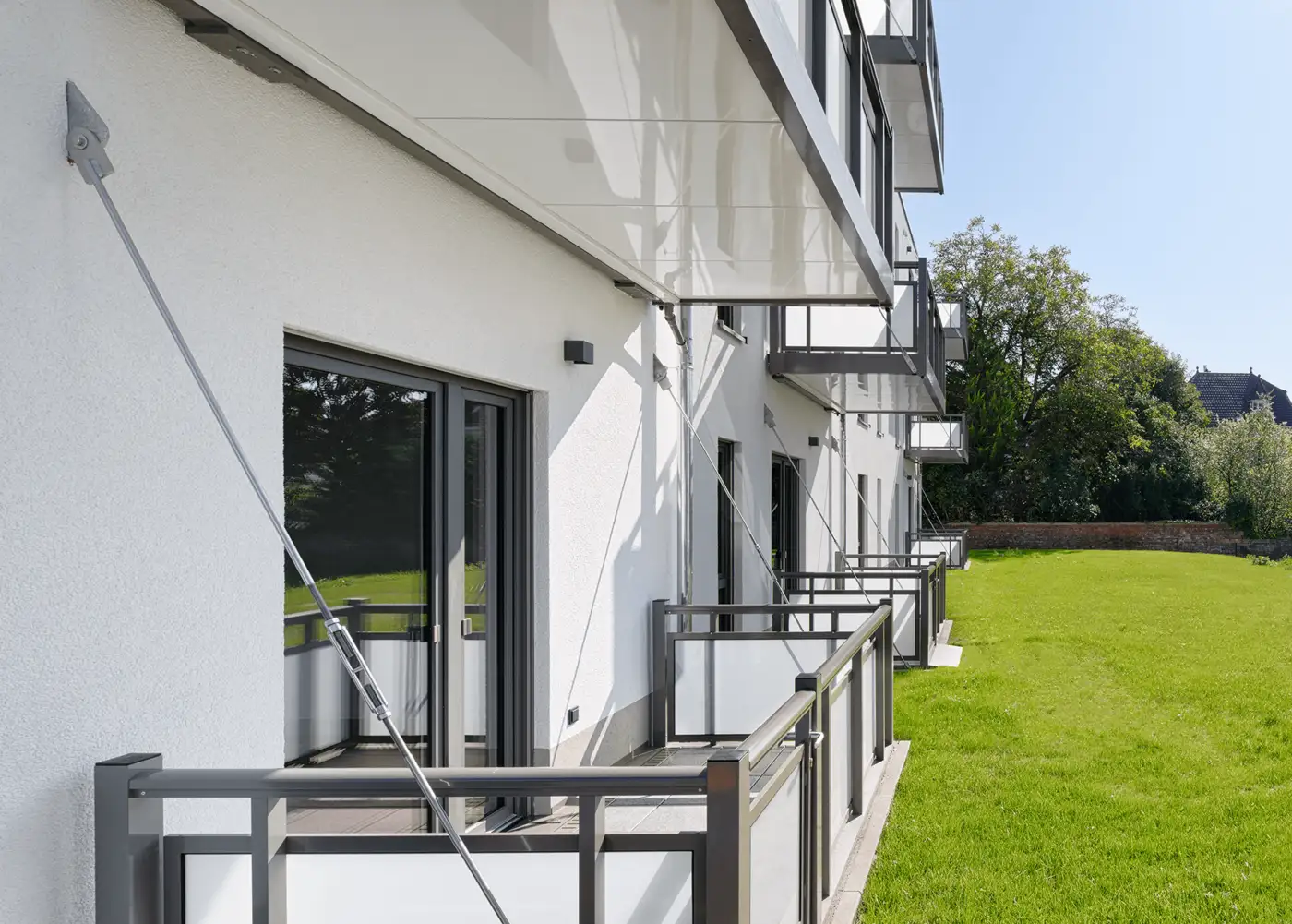 Zwei Wohnungen sind rollstuhlgerecht gestaltet, während alle barrierefrei sind. Beide Gebäude sind voll unterkellert und verfügen über eine Tiefgarage mit 21 PKW-Stellplätzen, Ladeboxen für Elektrofahrzeuge sowie Fahrradstellplätze. Die hellen Wohnungen überzeugen durch durchdachte Grundrisse, viel Stauraum, Fußbodenheizung und Balkone mit einem filigranen Hängesystem aus stabilen Stahlseilen. Die abgestimmten Fenster- und Wandfarben der Putzfassade tragen zu einem harmonischen Erscheinungsbild entlang der Dechant-Ibach-Straße bei. In Königswinter wurde die Modulproduktion bereits parallel zum Bau der Tiefgarage und der Unterkellerungen gestartet. Aufgrund der Rheinlage mussten diese als weiße Wannen ausgebildet werden. Durch die parallelen Prozesse verkürzt sich die Bauzeit der Modulbauweise erheblich. Vor allem der hohe Vorfertigungsgrad der dreidimensionalen Raumzellen ermöglicht eine Bauzeitverkürzung um bis zu 70 %. Die Montage der Module vor Ort erfolgt oft innerhalb weniger Tage.